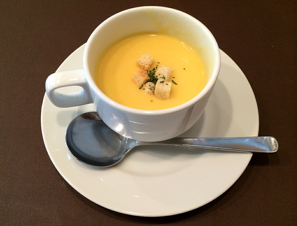 事にしました。まずはコーンポタージュから。洋食屋さんって感じですね。