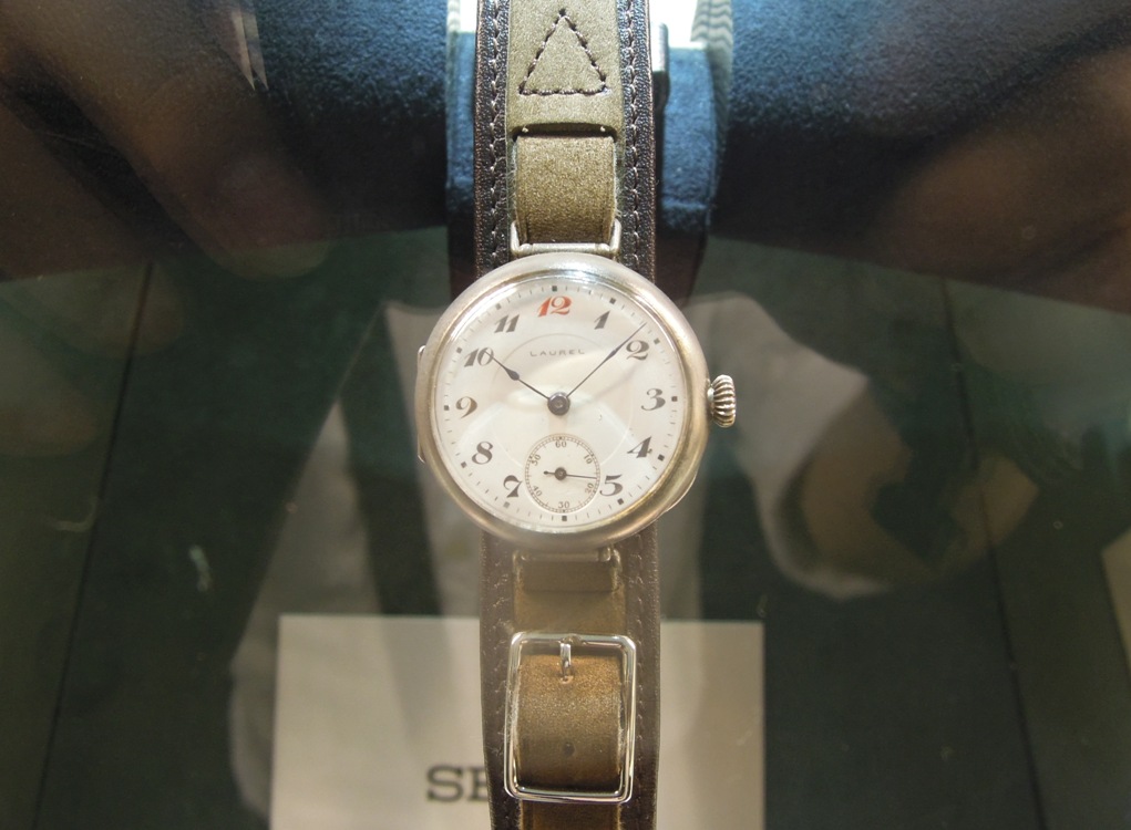 映り込んじゃってハッキリ撮れていませんが、国産初の腕時計「ローレル」